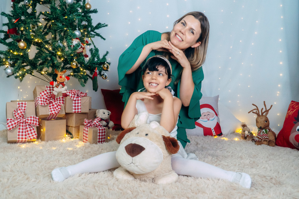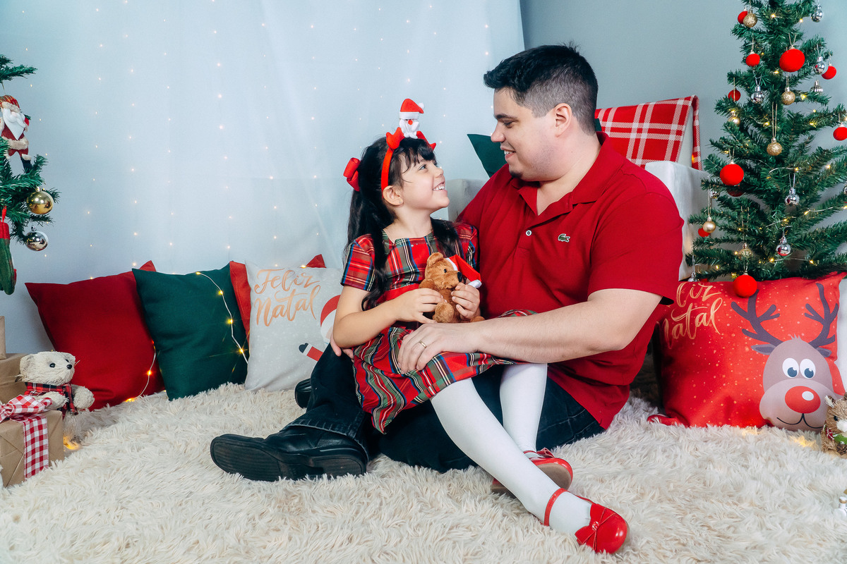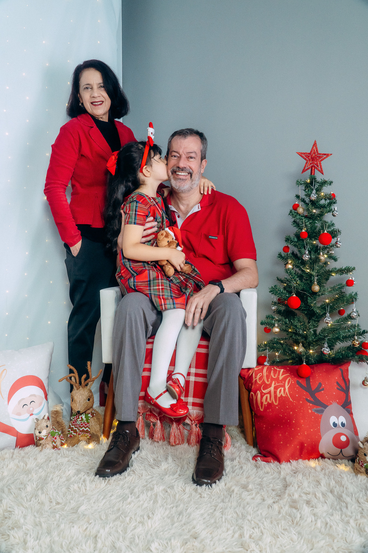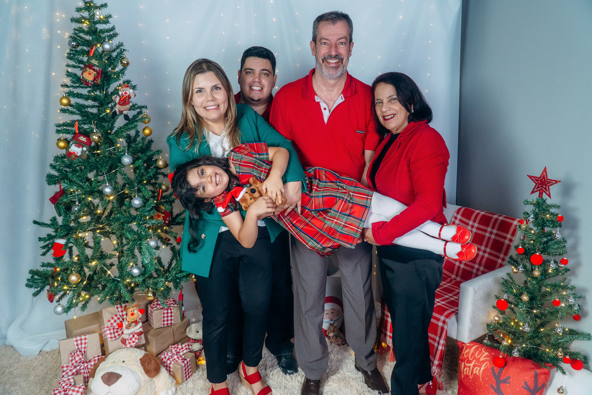 O cenário iluminado, as cores tradicionais e o brilho das luzes criam a atmosfera perfeita para eternizar sentimentos que vão muito além da imagem. Aqui, o que se registra não é apenas um retrato de Natal, mas um momento real de conexão familiar, onde o amor é o protagonista.